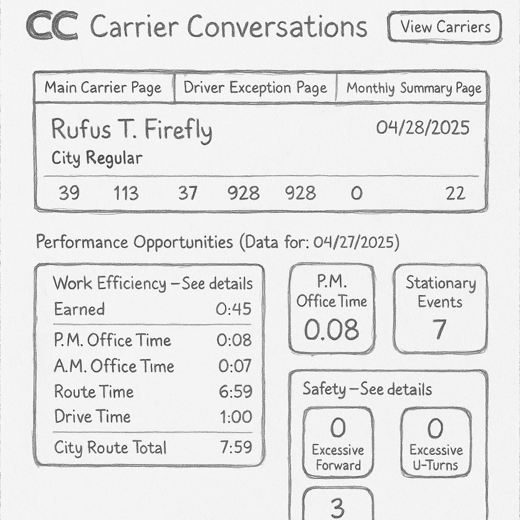 To ground the redesign in real user needs, I conducted a detailed audit of the existing system and interviewed both regional managers and carriers. Through these discussions, I mapped user workflows, pain points, and data priorities. Key insights included the need for real-time comparison to historical metrics, immediate surfacing of outlier performance, and a simplified way to track active delivery issues.