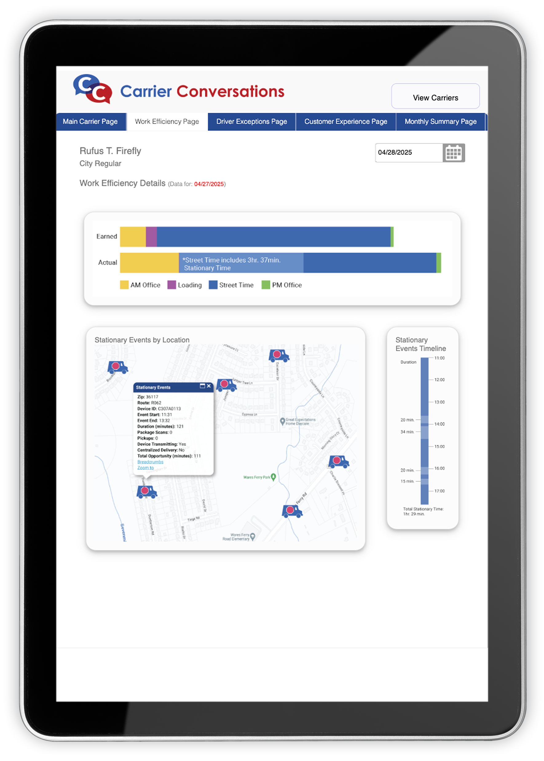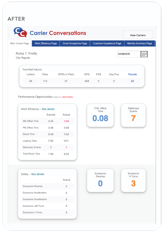 As the largest government agency in the United States, USPS operates on a massive scale, serving virtually every community nationwide. Managing this a vast network requires real-time insight into delivery operations at every level. I was tasked with redesigning a tablet-optimized dashboard to give regional managers a faster, clearer view of carrier performance metrics — and to empower them to drive measurable improvements in service quality.